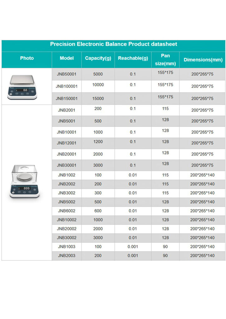 The JNB Series Precision Electronic Balance is engineered for high-accuracy weighing across a wide range of laboratory and industrial applications. With multiple models offering resolutions from 0.001g to 0.1g and capacities up to 30,000g, this series provides flexible solutions for precise measurement needs.